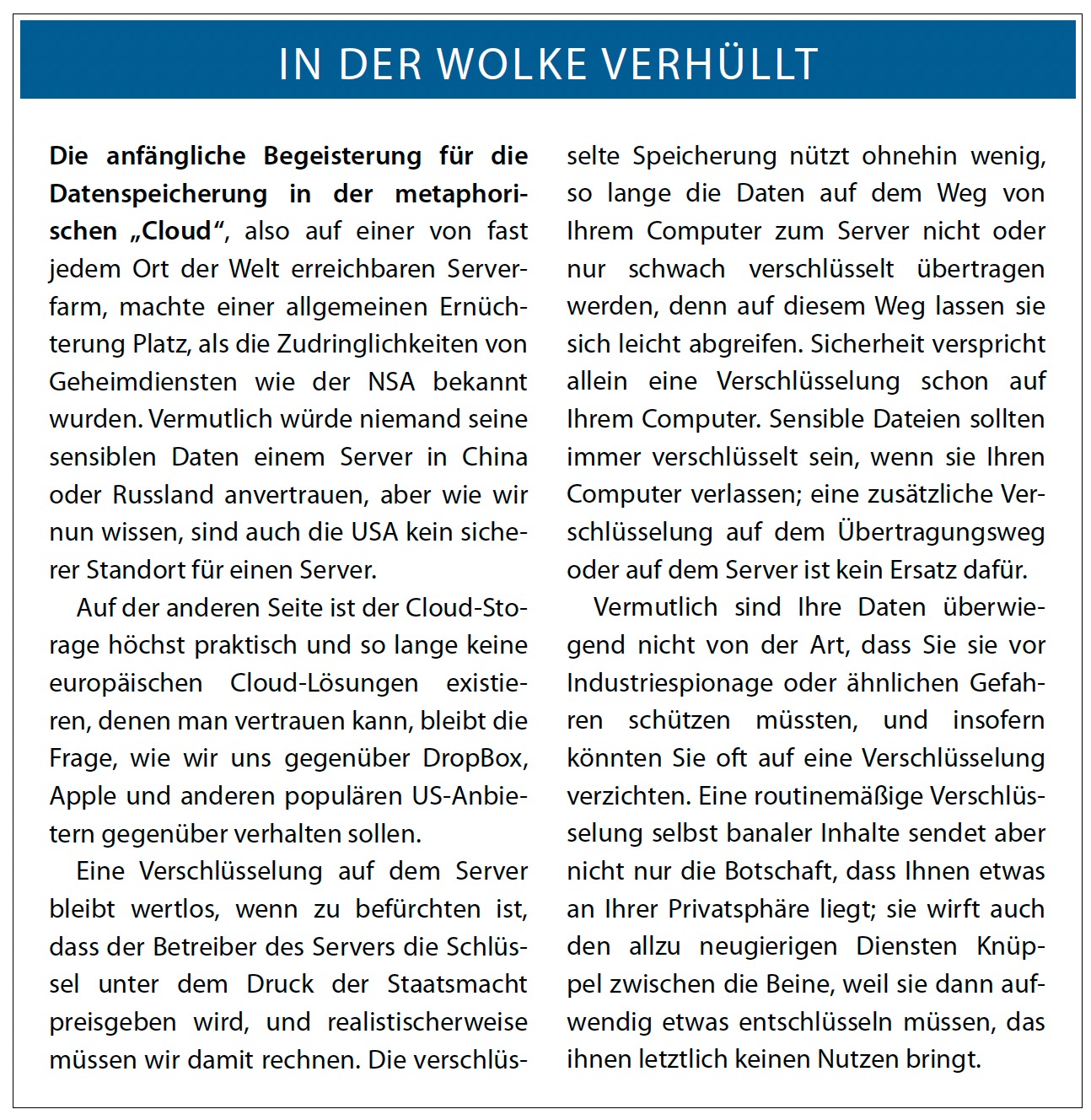 - Wenn Sie gar keine Cloud-Dienste nutzen, stellt sich das Problem erst gar nicht. Sie müssen eben auf deren Vorteile verzichten.