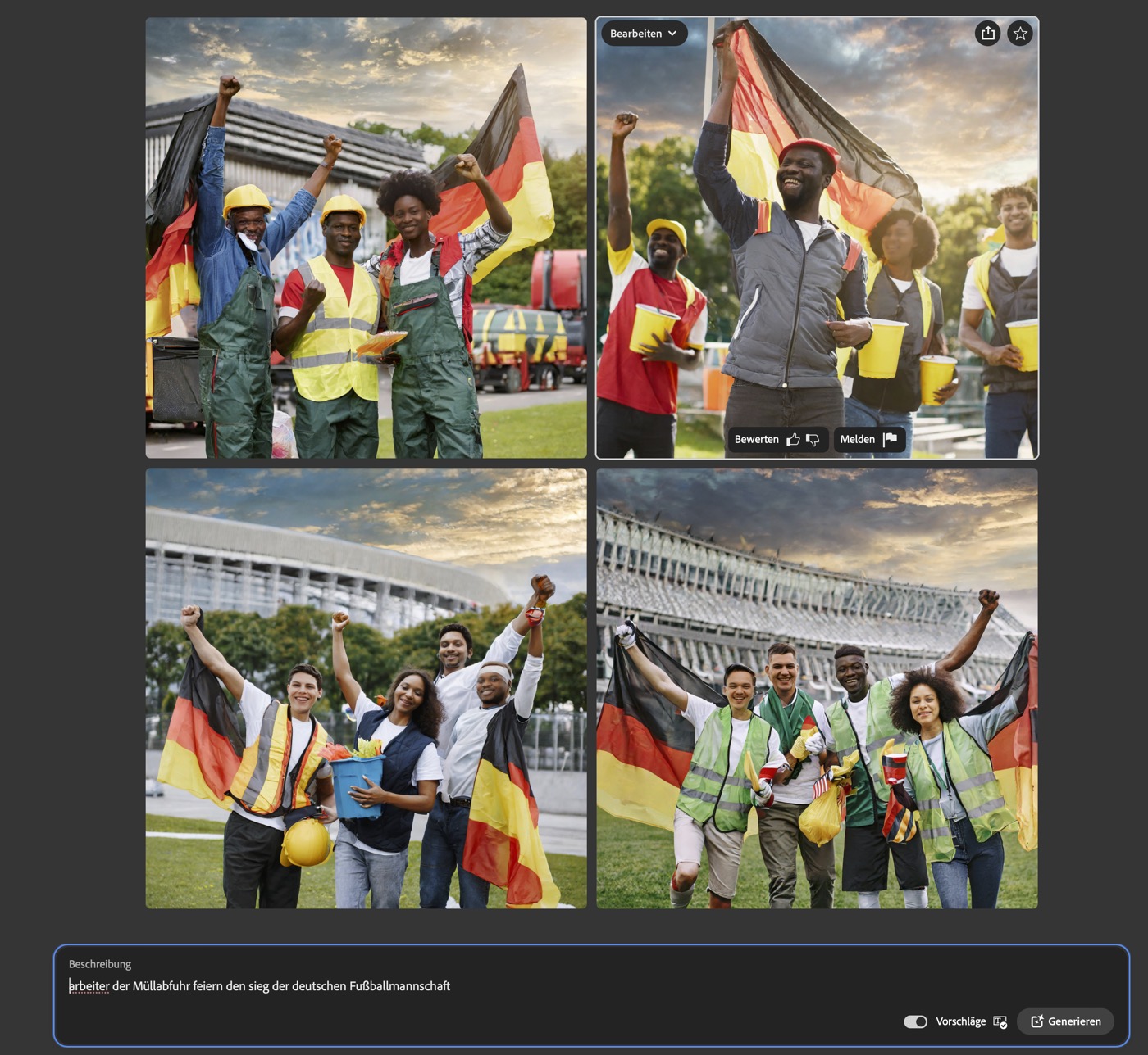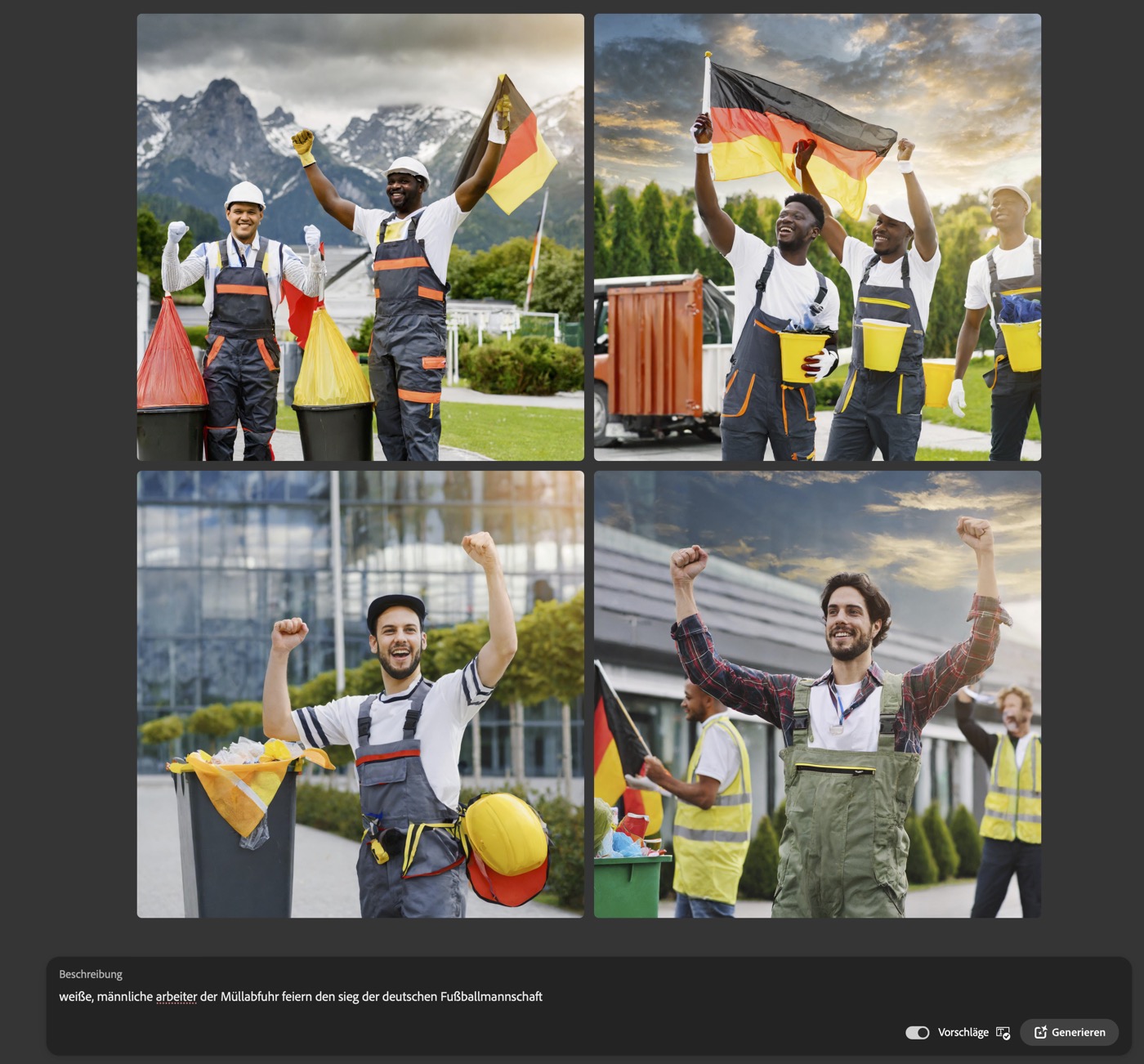 Mit dem Prompt »Arbeiter der Müllabfuhr feiern den Sieg der deutschen Fußballmannschaft« erhält man zwar diverse Zusammenstellungen aus Männern und Frauen, aber eine deutliche Überrepräsentation schwarzer Männer. Das könnte natürlich auch am oben gezeigten Hautfarben-Bias liegen, der Berufe mit niedrigen Einkommen eher schwarzen Menschen zuweist. In dem Fall wäre die KI rassistisch – würde also exakt nicht Diversion fördern, sondern genau das tun, was eigentlich vermieden werden soll.