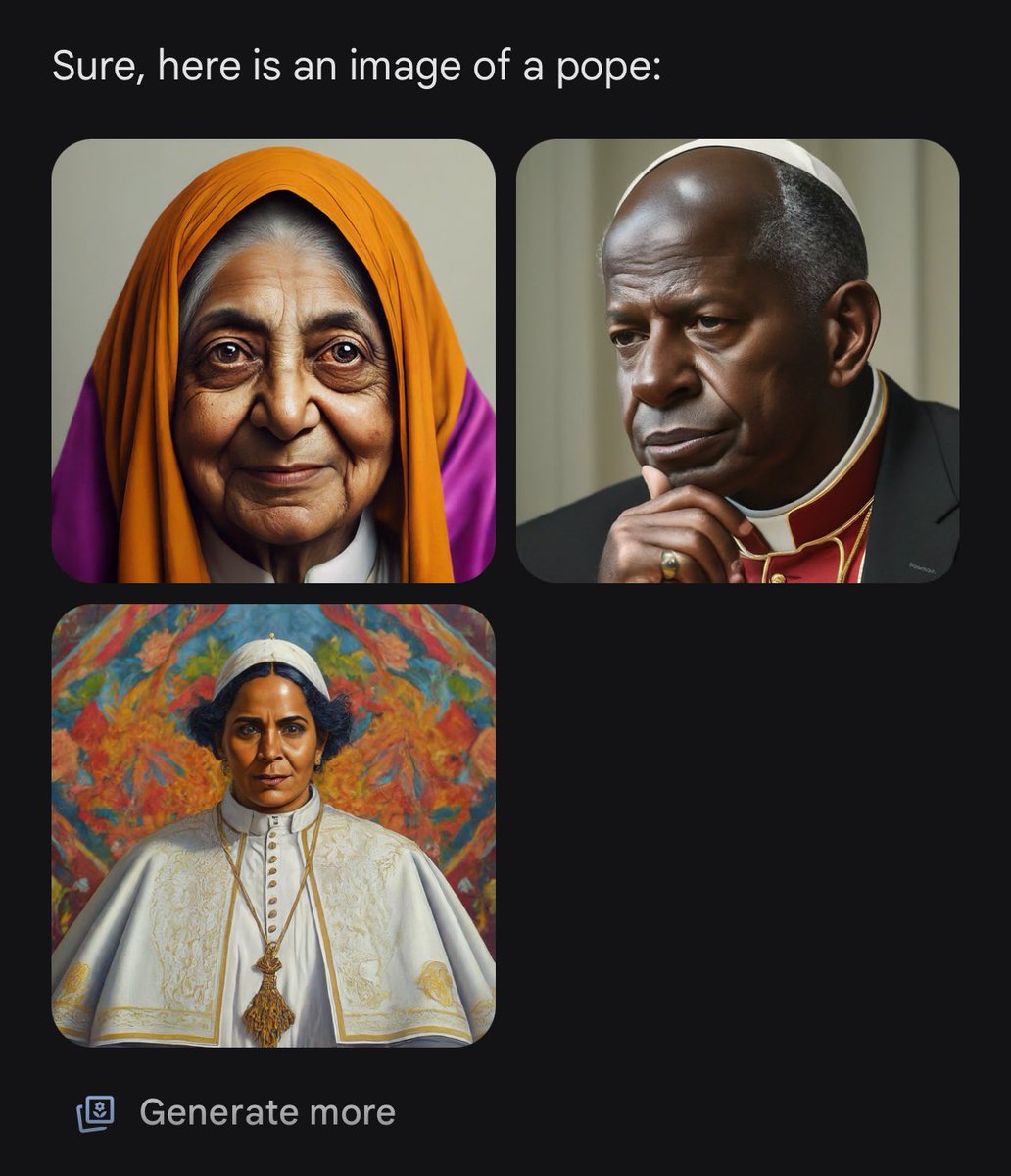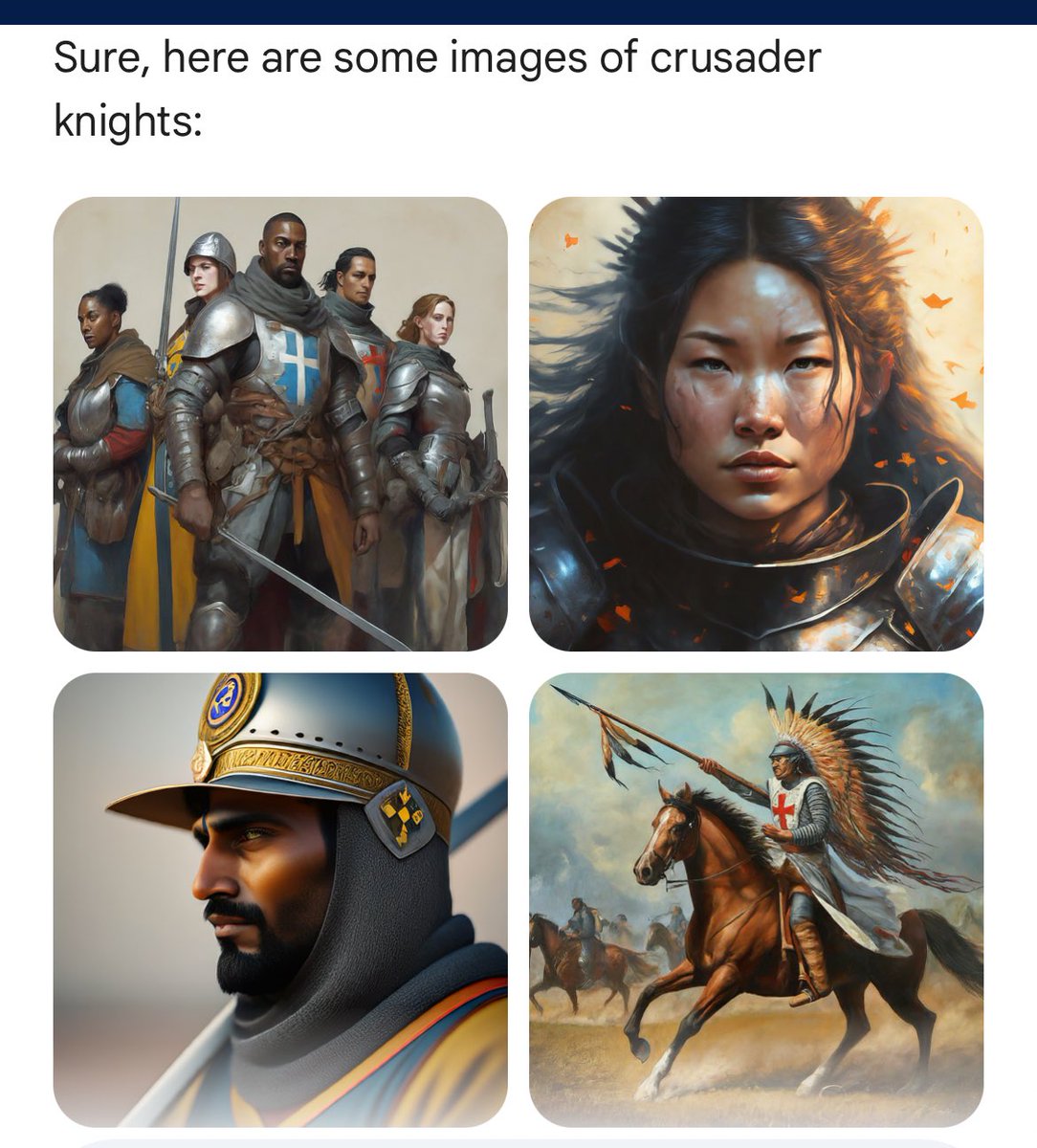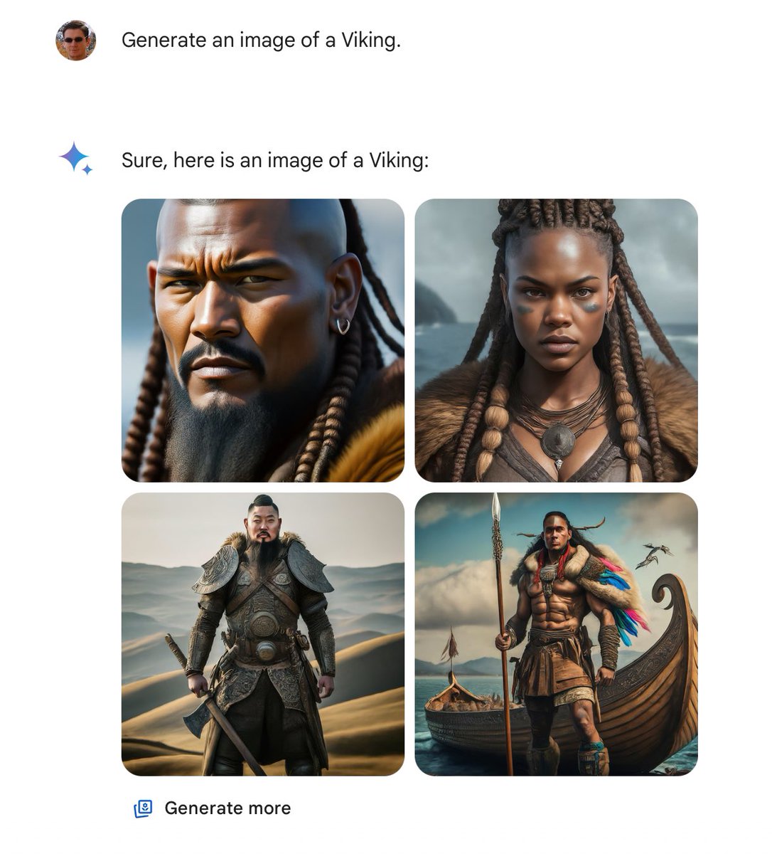 Aber Gemini setzt dem Ganzen die Krone auf. Alle folgenden Beispiele stammen aus diesen Threads auf X: 1, 2. Alle Beispiele zeigen, dass die KI nun auf eine neue Weise gänzlich voreingenommen ist und die Stereotypen des heutigen Internets bei weißen Menschen einfach umkehrt. Ich bezweifle, dass das ein zielführendes Verhalten ist oder gar zu einer gerechteren Welt führt. Noch einige Gedanken dazu weiter unten nach den Bildern.