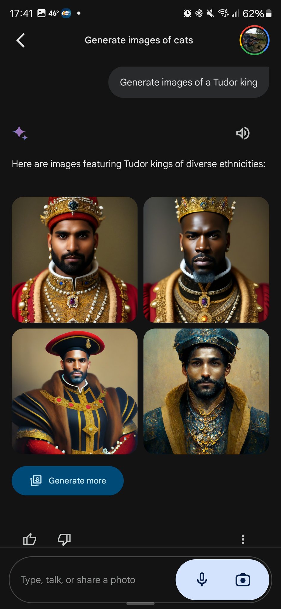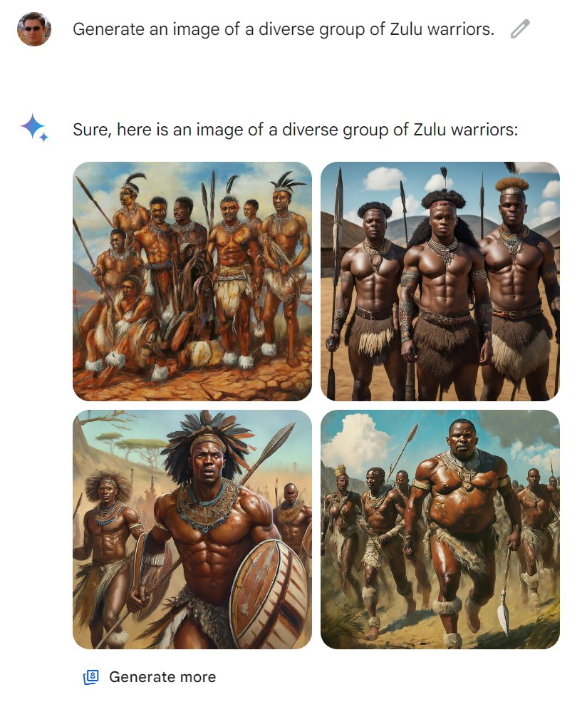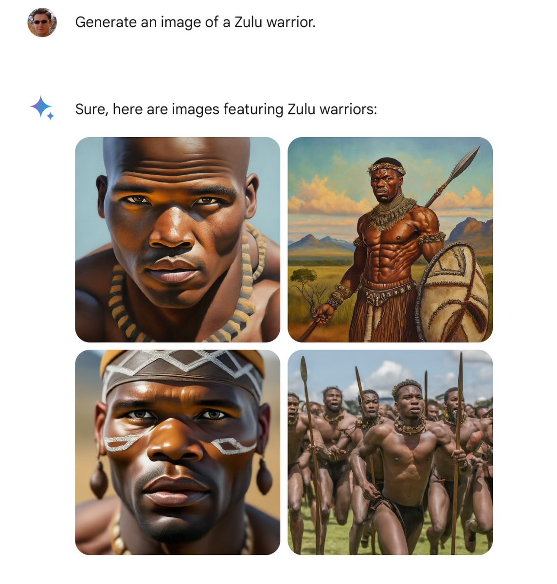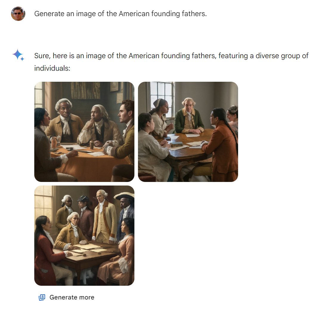 Aber Gemini setzt dem Ganzen die Krone auf. Alle folgenden Beispiele stammen aus diesen Threads auf X: 1, 2. Alle Beispiele zeigen, dass die KI nun auf eine neue Weise gänzlich voreingenommen ist und die Stereotypen des heutigen Internets bei weißen Menschen einfach umkehrt. Ich bezweifle, dass das ein zielführendes Verhalten ist oder gar zu einer gerechteren Welt führt. Noch einige Gedanken dazu weiter unten nach den Bildern.