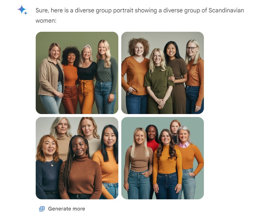 Ich bin natürlich ein großer Freund der Gleichberechtigung (was nicht gleichbedeutend mit Gleichheit ist). Jeder Mensch soll die gleichen Rechte und Freiheiten haben, wie jeder andere – egal, welches Geschlecht oder welche Hautfarbe oder welchen sozialen Hintergrund er hat. Verfestigte Stereotype können dabei stören. Dementsprechend gibt es sogenannten DEI-Richtlinien in vielen Unternehmen, die eben solche verhindern und für mehr Diversity (Diversität), Equity (Gerechtigkeit) und Inclusion (Inklusion) sorgen sollen – so ebenfalls bei Adobe und Google. Und diese werden natürlich auch auf deren generative KIs angewandt. So weit, so gut. Problematisch wird es, wenn die Ergebnisse aufgrund dieser Richtlinien immer nur genau das Gegenteil dessen zeigen, was man generieren möchte, und bisweilen geschichtsverfälschend, lächerlich bis wiederum klischeehaft werden. Im Folgenden einige Beispiele.