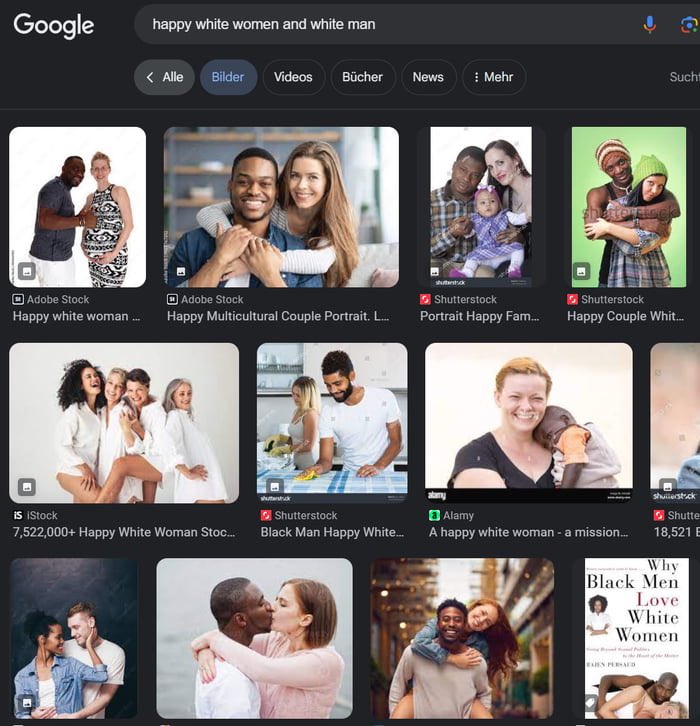 Schon die Google-Bildersuche liefert bei der Eingabe von »happy white woman and white man« kaum den gesuchten Foto-Inhalt (der Screenshot ist von X, aber ich habe es zusätzlich noch einmal selbst getestet):
