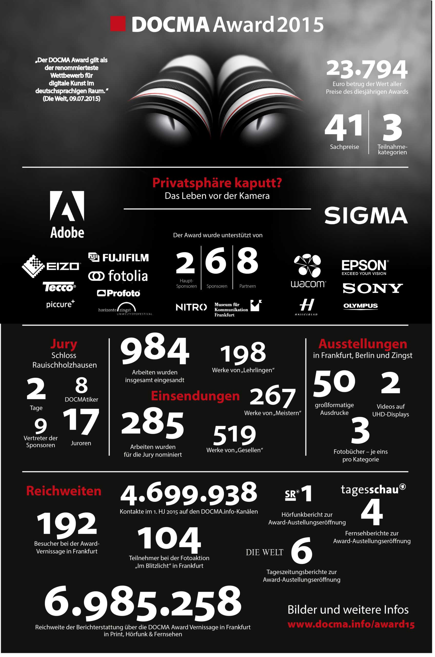 „Der DOCMA Award gilt als der renommierteste Wettbewerb für digitale Kunst im deutschsprachigen Raum“, schieb Die Welt am 9.7.2015. Wir haben jetzt die Zahlen zusammengetragen, die belegen, wie viele Menschen unser Award mit seinen tollen Bildern und starken Partnern erreicht.