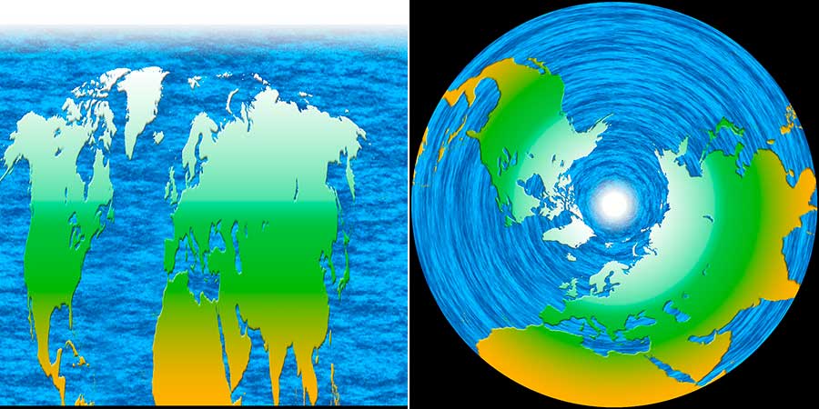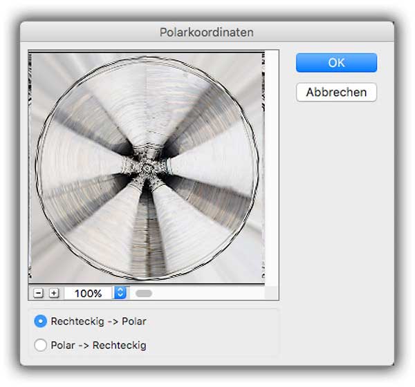 Was hat das alles mit Photoshop zu tun? Das Programm verfügt im „Filter“-Menü unter „Verzerrungsfilter“ (auch damals schon) über ein ganz einfaches Hilfsmittel, das nichts anderes tut, als Rechteckkoordinaten in Polarkoordinaten umzuwandeln und umgekehrt. Langweilige Geometrie? Im Gegenteil! Schauen Sie sich an, was sich mit Hilfe dieser Methode an beeindruckenden Bildeffekten erzeugen lässt. Ihnen wird bestimmt etwas einfallen, wozu Sie dieses Werkzeug bestens gebrauchen können.