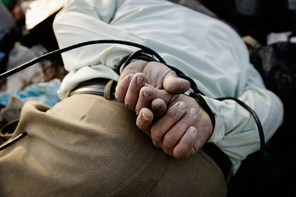 Pornografisch an diesem Band finde ich allerdings das Folgende: „Einige Doppelseiten im Buch sind unbeschnitten, also geschlossen. Der Leser kann sie entlang einer Perforation öffnen und so selbst entscheiden, wie viele der Bilder er sehen möchte, wie viele er ertragen kann.“ Das erzeugt einen Voyeurismus mit auf den Kopf gestellter Adventskalender-Erwartungshaltung: Dieses Foto war ja gar nicht so schlimm, wie entsetzlich wird wohl das nächste sein?