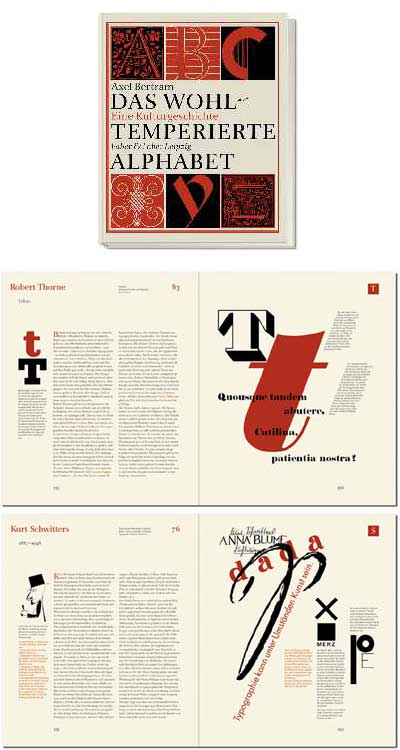 Axel Bertrams Das wohltemperierte Alphabet ? Eine Kulturgeschichte lässt einen Abriss der Schriftentwicklung erwarten, bietet aber etwas völlig anderes. Es geht in alphabetischer Reihenfolge um Menschen, die im letzten halben Jahrtausend zur Entwicklung der Typografie beigetragen haben, nicht in jedem Fall übrigens durch Schriftentwurf. Das Buch ist schön gestaltet, wenn auch der Schriftgrad der Bildlegenden etwas klein geraten ist; die konsequent verwendete Schmuckfarbe rot hält dier Doppelseiten zusammen. Die Typo-Beispiele sind mitunter zu exemplarisch knapp geraten.