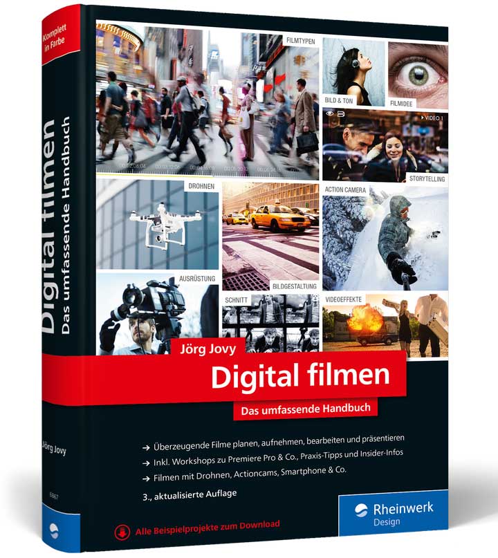 Schließlich stieß ich auf das Buch „Digital filmen“ von Jörg Jovy. Das umfangreiche Fachbuch aus dem Rheinwerk Verlag beschäftigt sich mit allen Aspekten des Filmens – von der Idee über das Drehbuch, das Budget, die Schauspieler, rechtliche Fragen bis hin zur Bildgestaltung und Beleuchtung – um nur einige zu nennen.