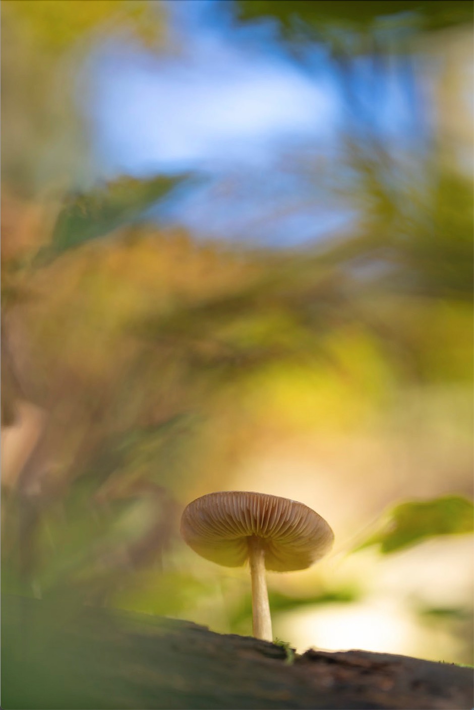 Das Blau des Himmels bietet einen schönen, komplementären Farbkontrast zum Pilz im Vordergrund. (Foto: Sebastian Worm). Makrofotografie