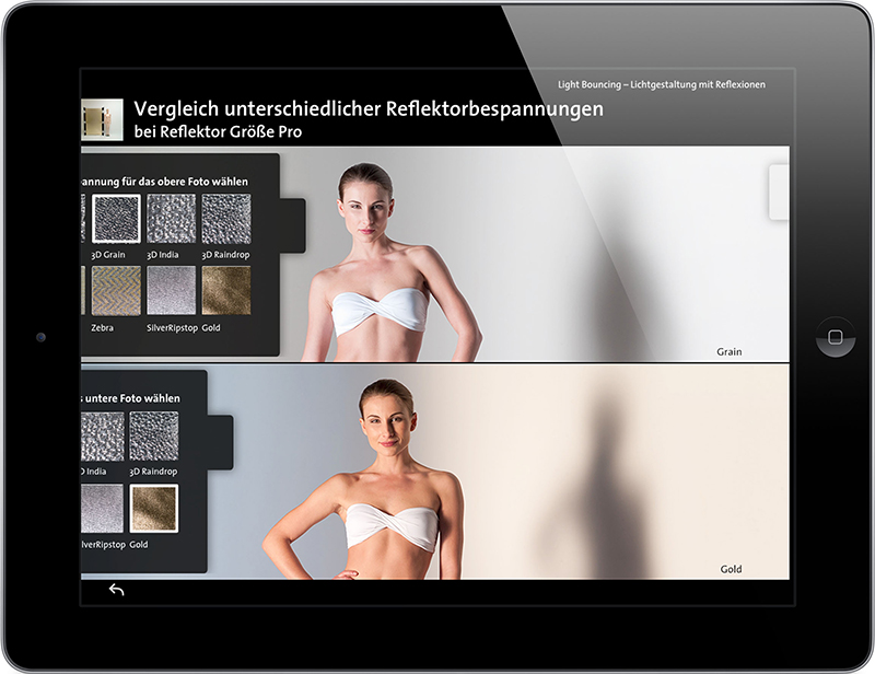 Leuchten lernen, das ist das Thema dieses digitalen Buches in Form einer iPad-App. In beindruckend knapper Form, also ideal für viele Praktiker, zeigt Autor Eib Eibelshäuser wie man mit Hilfe von Reflektoren und Diffusoren gezielt Licht setzt. Leicht verständlich und mit hohem Nutzwert, wenn man denn die dafür nötigen Produkte besitzt. Man erfährt auf 50 Screens sowie mit Hilfe von mehr als 260 Fotos, wie sich Reflektoren unterschiedlicher Größen und Bespannungen beim Ausleuchten von Porträts auswirken und kann sogar die Wirkung verschiedener Reflektorbespannungen vergleichen. Diese Funktion ist denn auch die einzige, die inhaltlich rechtfertigt, warum dieses Werk digital und nicht gedruckt erscheint. Ansonsten ist es den Produzenten gelungen, eine nahezu perfekte und sehr ansprechend gestaltete Bedienungsanleitung für die Produkte des California Sunbounce-Produktportfolios in Apples iTunes Store zu platzieren. Etwas stutzig macht, warum man für diese Promotion-App 10,99 zahlen muss und sie nicht als Beigabe zum Erwerb eines California-Sunbounce-Produkts gratis bekommt. So ansprechend, wie sie gemacht ist, dürfte sie zu weiteren Käufen verführen.