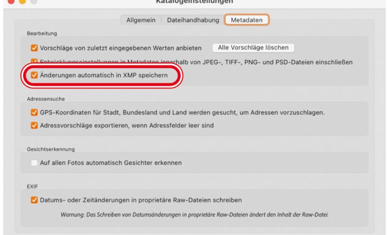 Eine gewisse Unabhängigkeit vom Lightroom-Katalog erhalten Sie, wenn Sie die XMP-Daten exportieren. Die Option finden Sie in den »Katalogeinstellungen« unter…