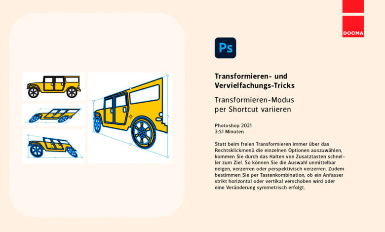 Spielzeit: 4 Minuten Direktlink: www.docma.info/22038 Statt beim »Frei transformieren« immer über das Rechtsklickmenü die einzelnen Optionen durchzuschalten, kommen Sie durch…