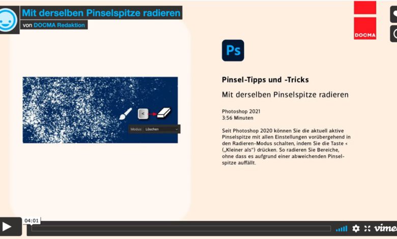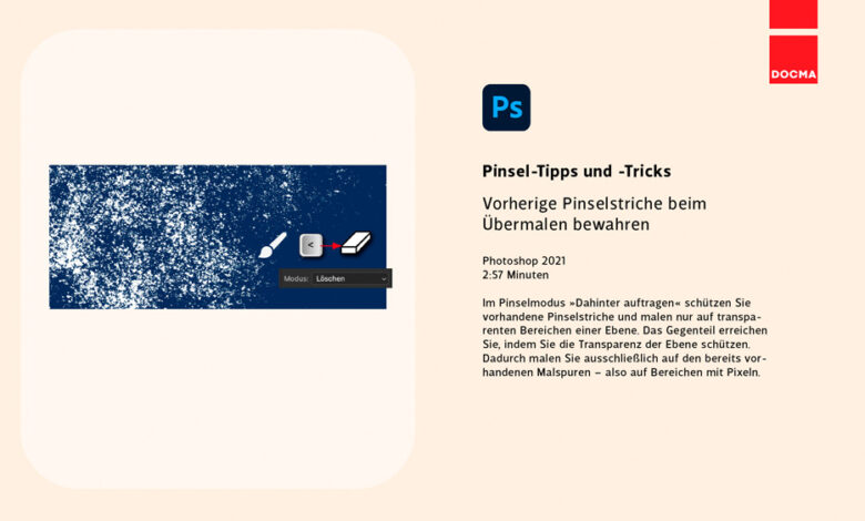 Spielzeit: 3 Minuten Direktlink: www.docma.info/22035 Im Pinselmodus »Dahinter auftragen« schützen Sie vorhandene Pinselstriche und malen nur auf transparenten Bereichen einer…