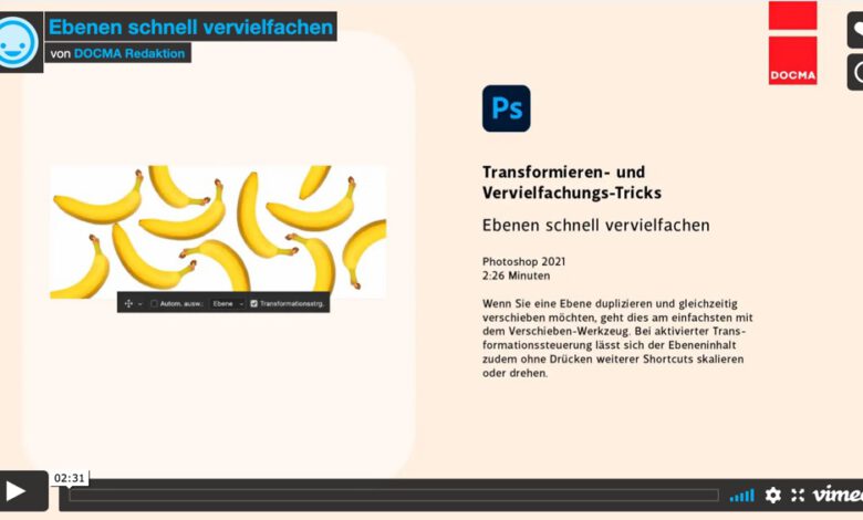 Direktlink: https://vimeo.com/497711255/ec2ab329c8 Spielzeit: ca. 2:30 Minuten Mit dem Shortcut »Strg/Cmd-J« duplizieren Sie eine Ebene. Falls Sie das duplizierte Element aber…