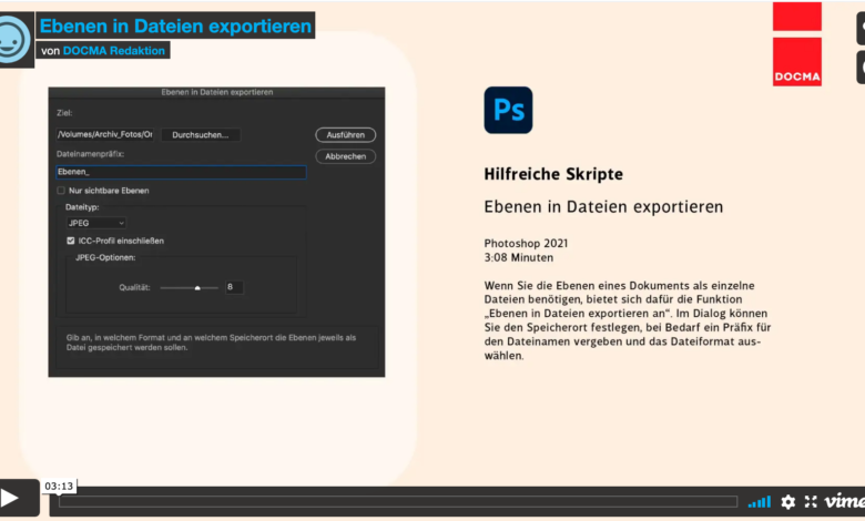 Spielzeit 3:13 Direktlink: https://vimeo.com/497709104/fbc2b8c6a3 Falls Sie die Ebenen eines Dokuments als einzelne Dateien benötigen, nutzen Sie dafür die Funktion »Datei…