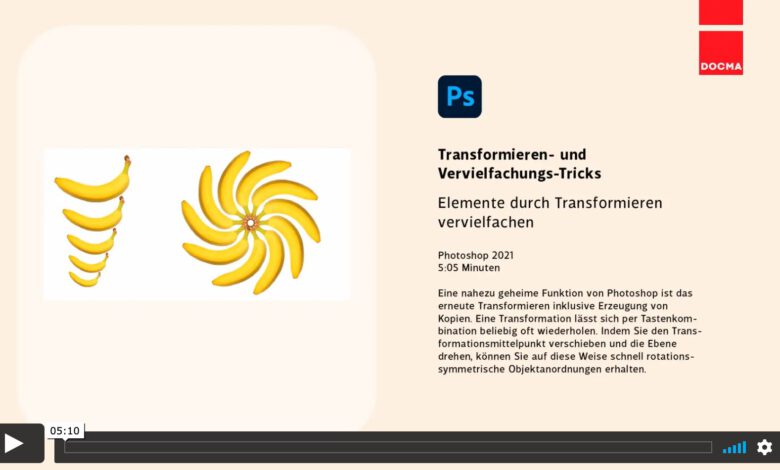 Eine nahezu geheime Funktion von Photoshop ist das erneute Transformieren inklusive Erzeugung von Kopien. Stellen Sie ein Objekt (hier: die…