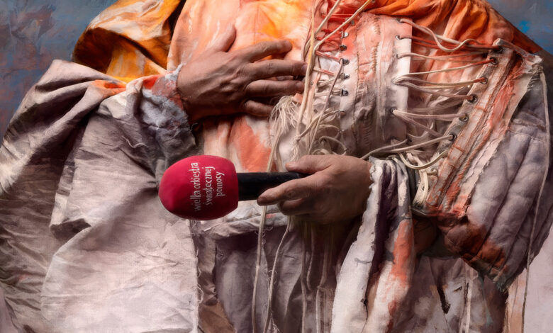 Jerzy Owsiak ist ein polnischer Rundfunkjournalist und Präsident der bedeutenden karitativen Stiftung WAŚP. Er posiert im Stil des „Porträt von…