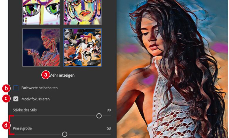 Lesedauer 1 min Der Neural-Filter »Stilübertragung«, ahmt den Bildstil einer der unzähligen mitgelieferten Vorlagen nach, die Sie unter »Mehr anzeigen«…