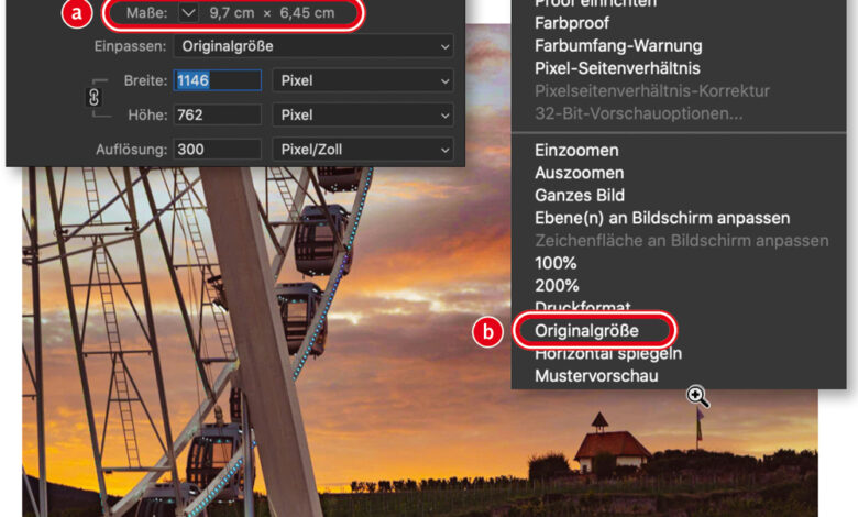 Photoshops Befehl »Ansicht > Druckformat« sorgt dafür, dass Ihr Dokument auf dem Bildschirm in genau der Größe angezeigt wird, die…