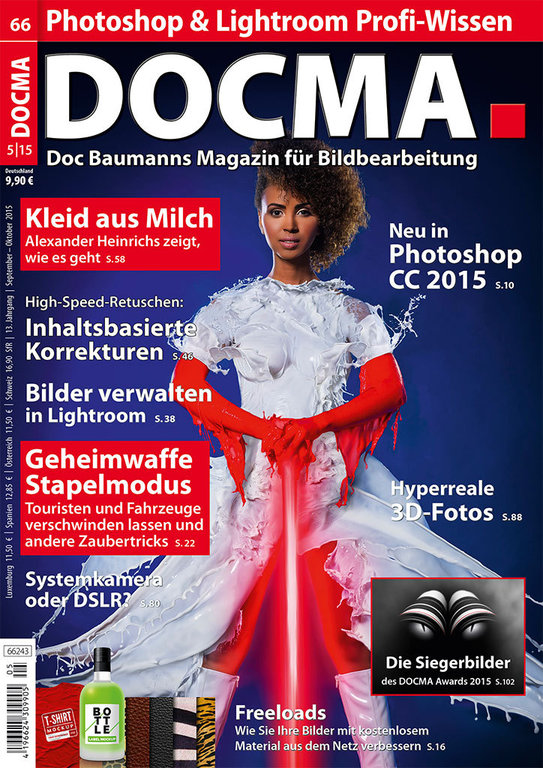 Weitere Inhalte: Kleid aus Milch, IM FOKUS: Geheimwaffe Stapelmodus, Neu in Photoshop CC 2015, Calvin Hollywoods Schlüsseltechniken: Mattgrafisch-analoger Look, LIGHTROOM-AKADEMIE: Bilder verwalten, PHOTOSHOP-AKADEMIE: Inhaltsbasierte Tools, Schlagschatten konstruieren, Systemkamera oder DSLR?, Die Siegerbilder des DOCMA Awards, Hyperreale 3D-Fotos, Kalenderprojekt: 12 Monate in Monopoli – Ein Kalender, Kreativ mit Freeloads und vieles mehr.
