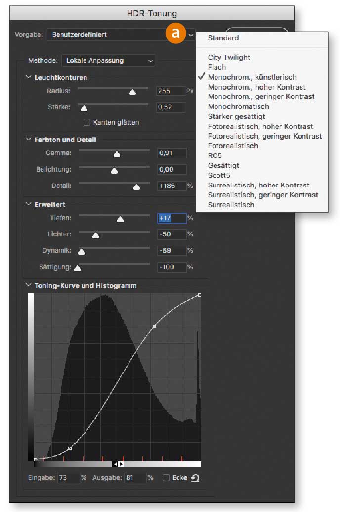 Im Dialog stimmen Sie das Bildergebnis über die Regler unter »Leuchtkonturen«, »Farbton und Detail« sowie »Erweitert« direkt ab. Ganz unten im Dialog steht Ihnen auch eine Gradationskurve zur Verfügung. Entscheidend für die Detailwirkung sind vor allem die Regler »Radius« und die zugehörigen Parameter »Stärke« sowie »Details«. Mit »Gamma« lässt sich der Kontrast vermindern, wodurch Sie höhere Werte für die Detailverstärkung wählen können, ohne einen Tonwertbeschnitt in den resultierenden Leuchtkonturen zu erhalten.