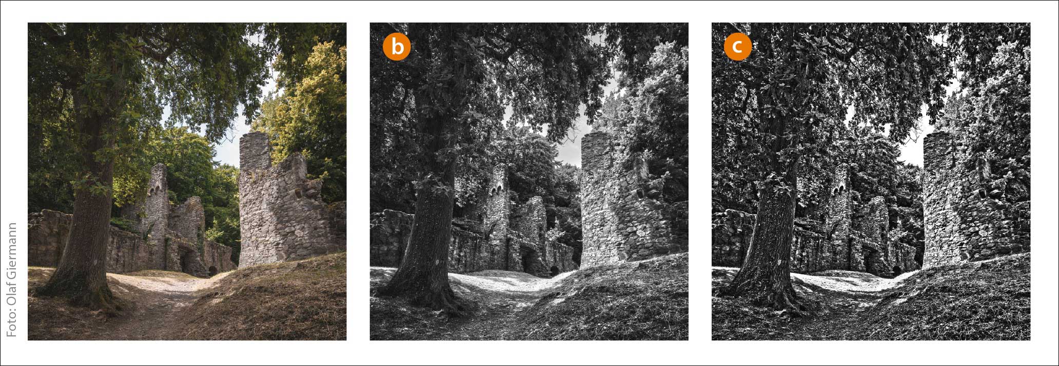 Wählen Sie dazu aus dem Dropdownfeld »Vorgabe« eines der Monochrom-Presets (a). Die Ergebnisse reichen hier von einem leicht dramatisch wirkenden Schwarzweiß-Bild (b) bis hin zu fast schon grafisch anmutenden Detailverstärkungen (c).