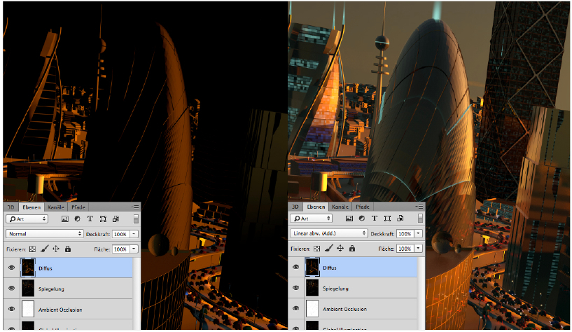 Die Postproduktion eines Renderings beginnt stets mit der Kontrolle der Füllmethoden. Cinema 4D hat die Eigenart, den Diffuskanal beim Multipassrendern mit der Füllmethode »Normal« zu verrechnen. Das ist an sich in Ordnung – bei nur einer Ebene. Sollten aber wie hier noch weitere Ebenen mitgerendert worden sein, wie beispielsweise der Spiegelungskanal, muss die Füllmethode des Diffuskanals auf »Linear Abwedeln« gestellt werden. Denn diese Füllmethode erkennt Schwarz nicht und stellt den Diffuskanal, der ja nur Farbinformationen enthalten sollte, korrekt dar – nämlich farbig, ohne andere Ebeneninhalte zu verdecken.