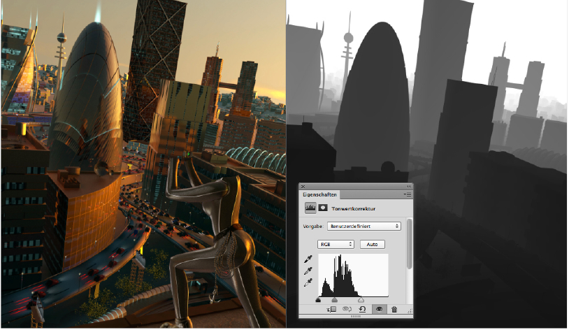 Doch das war noch lange nicht alles in der Zusammenarbeit der beiden Programme, denn Cinema 4D kann noch mehr zur Vorbereitung für Photoshop beitragen. Da die 3D-Szene der Stadt eine reale Tiefe besitzt, deren Koordinaten also einen echten, dreidimensionalen Raum beschreiben, kann man neben den Alpha-Kanälen auch eine sogenannte Tiefenmap mitrendern lassen. Diese wertet die Entfernung zwischen den einzelnen Objekten und der Kameraposition aus und stellt diese Tiefeninformation als Luminanzwerte dar. Je weiter ein Objekt von der Kamera entfernt ist, desto heller wird es dargestellt. Lädt man den als „Tiefenmap“ bezeichneten Alphakanal in Photoshop, kann man ihn in Form einer Ebenenmaske einsetzen und damit beispielsweise eine Gradationskurve oder Tonwertkorrektur steuern. Was nah ist, bleibt dunkel und tonwertreich, während weiter entfernte Stadtteile im Dunst verblassen. Übrigens verfügt Photoshop über einen sehr ähnlichen Mechanismus im 3D-Bereich der Extended Version.