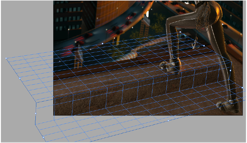 Den Schatten des Models können Sie in Photoshop aus dem Alphakanal für das Model erzeugen. Er könnte auch bereits in Cinema 4D gerendert werden, nur hätte man dazu eine weitere Lichtquelle anlegen müssen. Er wird vertikal gespiegelt und geneigt, doch berücksichtigt er dann noch immer nicht die Stufe im Vordergrund. Kopiert man ihn in die Zwischenablage und zieht im Fluchtpunktfilter ein perspektivisches Gitter über der Stufe auf, so kann man den Schatten in dieses Gitter einfügen, skalieren und drehen, bis er zum Model und zu der Stufe passt. Zeichnet man ihn nun noch weich, verankert er das Model in der Szene.