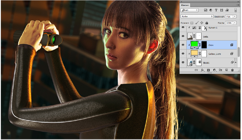Das abendliche Licht der tiefstehenden Sonne ist von gelb-oranger Farbe. Um nun die Lichter der Model-Ebene dieser Farbe anzupassen, die Mitteltöne und Schattenbereiche aber aus der Korrektur auszuschließen, legen Sie einfach eine neue Füllebene an. Danach öffnen Sie den Ebenenstil und ziehen den Lichterregler von »Darunter liegende Ebene« nach links. Mit »alt«-Taste splitten Sie die Regler für weiche Tonwertübergänge. Sollten Sie dann feststellen, dass die Farbe nicht ganz genau passt, klicken Sie in die Füllebene und passen Sie die Farbe an. Das alles klappt mit dem fluoreszierenden Licht des Fernglases übrigens genau so gut.