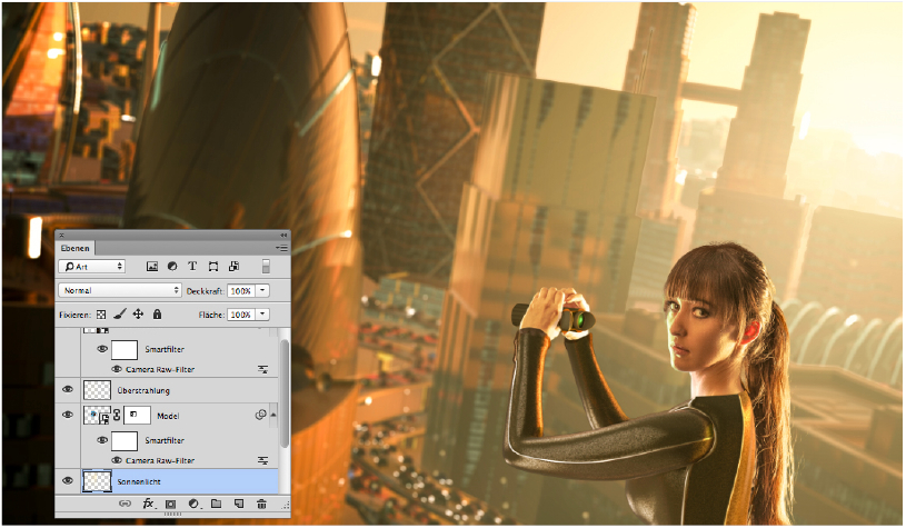 Auch der Standpunkt der Kamera, in diesem Fall hoch über einer Stadt in der Szene positioniert, ist mit 3D-Software leicht zu bewerkstelligen; wer einmal versucht hat, Zutritt zu einer der oberen Etagen eines Hochhauses abseits der üblichen Aussichtspunkte zu bekommen, weiß, wovon hier die Rede ist. Die Fotografie hingegen bringt auf sehr einfache Art und Weise Leben in die futuristische Kunstwelt. Die Aufgabe von Photoshop ist es, beide Bildbestandteile miteinander zu verbinden und so dafür zu sorgen, dass das Motiv am Ende wie aus einem Guss wirkt.