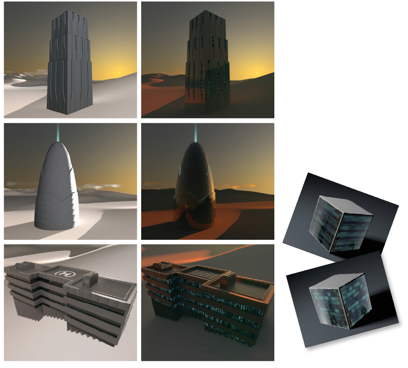 Insgesamt sind es zehn unterschiedliche Gebäude, die in der Szene der Stadt verbaut wurden. Einige davon kommen sogar doppelt vor, was aufgrund der unterschiedlichen Kameraperspektive nicht auffällt, aber viel Arbeit spart. Die Modelle bestehen größtenteils aus parametrischen Grundobjekten wie Würfeln oder Kugeln, die mit klassischen Modellierungswerkzeugen bearbeitet wurden. Damit die Gebäude trotz des nicht allzu großen Detailreichtums aber nicht flach oder gar künstlich wirken, kommen kleinteilige und reflektierende Materialien zum Einsatz. Denn je mehr „eye candy“ ein Objekt zugewiesen bekommt, desto detailreicher und realistischer wirkt es.