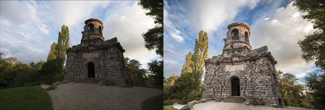 Architekturfotos Am Beispiel dieses nachempfundenen, römischen Tempels aus dem Schwetzinger Schlossgarten sehen Sie, dass Sie die „High-Five“ auch komplett in Camera Raw anwenden können. Die »Objektivkorrekturen« von Camera Raw sind qualitativ sogar dem Filter »Objektivkorrektur« vorzuziehen und bieten mit »Upright« Möglichkeiten, die der Filter nicht besitzt.