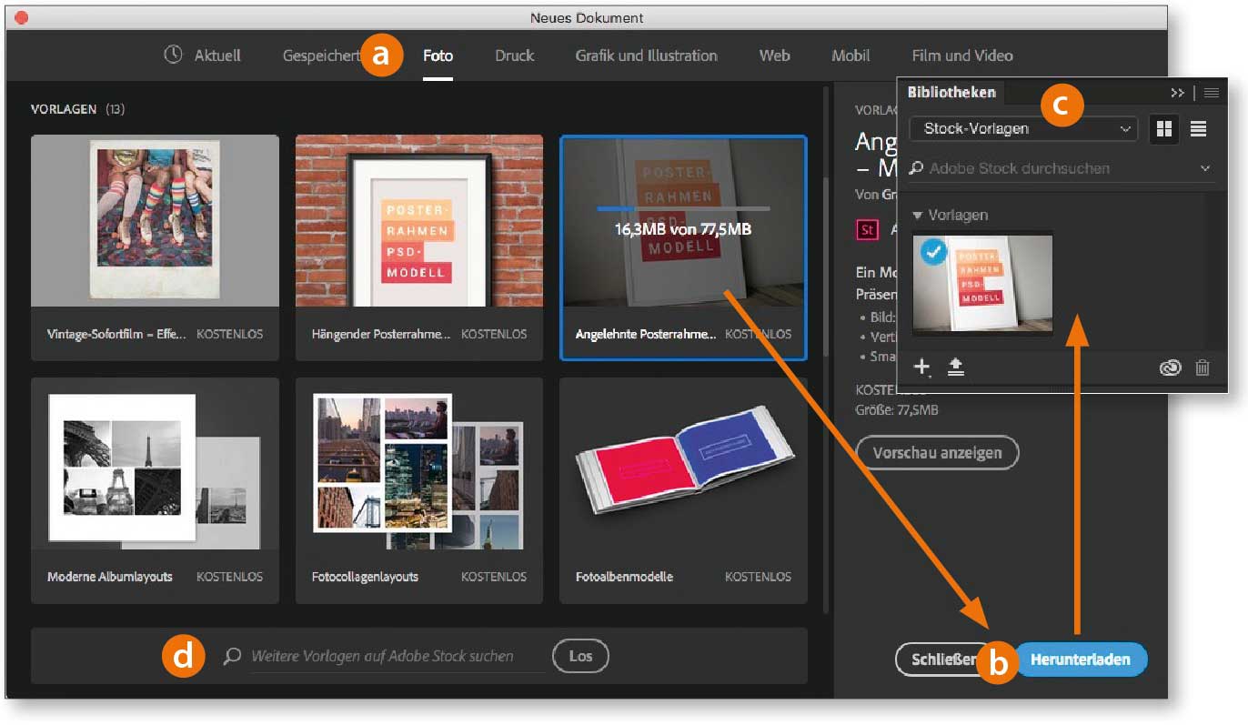 Im Dialog »Datei > Neu« finden Sie in den einzelnen Kategorien (a) bereits eine Reihe – teilweise kostenloser – Vorgaben, die Sie als Ausgangspunkt für Ihr Projekt nutzen können. Mit einem Klick auf »Herunterladen« (b) wird die Vorlage in eine automatisch erzeugte Creative Cloud-Bibliothek namens »Stock-Vorlagen« hinzugefügt, auf die Sie über »Fenster > Bibliotheken« zurückgreifen können (c). Dort lässt sich die geladene Vorlage bei Bedarf auch wieder löschen. Über die Suchfunktion im Dialog (d) finden Sie per Stichwort weitere Adobe Stock-Vorgaben. Nach einem Klick auf »Los« öffnet sich Ihr Standard-Internetbrowser mit den Suchergebnissen.