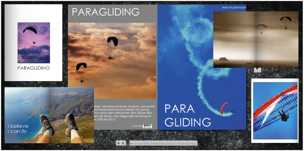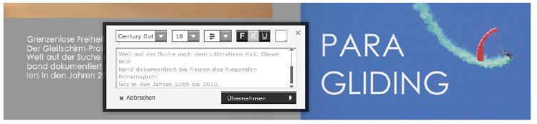 Die erste Aufmacher-Doppelseite sollte stets ein hochklassiges Motiv zieren, das den Leser visuell in seinen Bann zieht. Im Beispiel ist die Auswahl auf ein „Luftbild“ gefallen, das die Landschaft unter dem Gleitschirmflieger über seine Füße hinweg zeigt. Dazu wurde der Bildcontainer zentriert in der Seitenmitte ausgerichtet und dann so weit aufgezogen, bis er über die Seitenränder hinaus reichte.