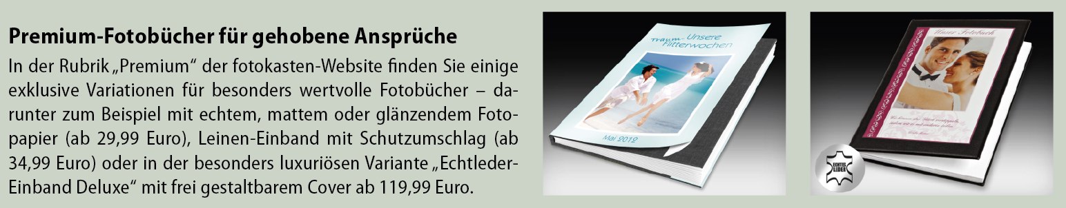 Zunächst einmal müssen Sie sicherstellen, dass Ihr Web-Browser Adobe Flash und Java beherrscht. Sollte diese Software noch nicht installiert sein, müssen Sie zunächst einmal www.docma.info/10585 und www.docma.info/10585 besuchen. Anschließend surfen Sie zur Website www.fotokasten.de und machen sich auf der Startseite der Rubrik »Fotobuch« über die neuesten Angebote schlau. In diesem Workshop verwenden wir den Klassiker „Comfort A4 hoch“ – 28 bis 200 Seiten mit Hardcover-Einband, erhältlich ab 29,99 Euro. Wenn Sie etwas Besonderes suchen, sollten Sie die Rubrik »Premium-Fotobücher« besuchen (siehe Kasten auf der nächsten Seite).