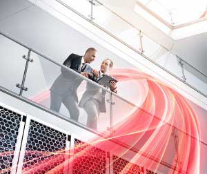 Diese Kampagne entstand für den Kunden Fujitsu, der die Motive sowohl für Printprodukte als auch online nutzt. Wenn, wie in diesem Fall, weder die klassische Fotografie noch die reine Umsetzung der Motive in Cinema 4D sinnvoll erscheint, kombiniert man einfach beide Techniken. Den Talk am Geländer kann man deutlich schneller fotografieren als ihn in dieser hohen Detailtreue zu modellieren, während der Raum mit verhältnismäßig geringem Aufwand angelegt werden kann. Die Montage der beiden Models erfolgt klassisch in Photoshop, wobei sowohl Licht als auch Perspektive bereits möglichst genau stimmen sollten.