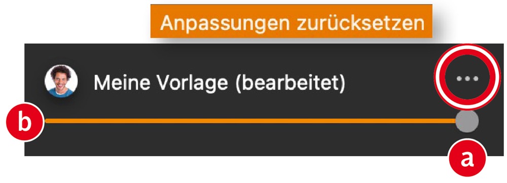 Die Option, mit der man alle in Luminar AI vorgenommenen Änderungen auf einmal zurücksetzen kann, ist nicht ganz so leicht zu finden, wie der Rest seiner Bedienelemente. Man würde eine solche Funktion am ehesten in der Nähe der Vorschau-, Abbrechen- und Anwenden-Schaltflächen oben rechts im Dialog vermuten. Sie finden die Option jedoch ganz unten rechts neben „Meine Vorlage“ im Drei-Punkte-Menü. Wählen Sie dort den Befehl »Anpassungen zurücksetzen«, um das Bild wieder in den Ausgangszustand zu bringen (a). Mit dem Schieberegler darunter können Sie übrigens alle vorgenommenen Einstellungen stufenlos verblassen (b).