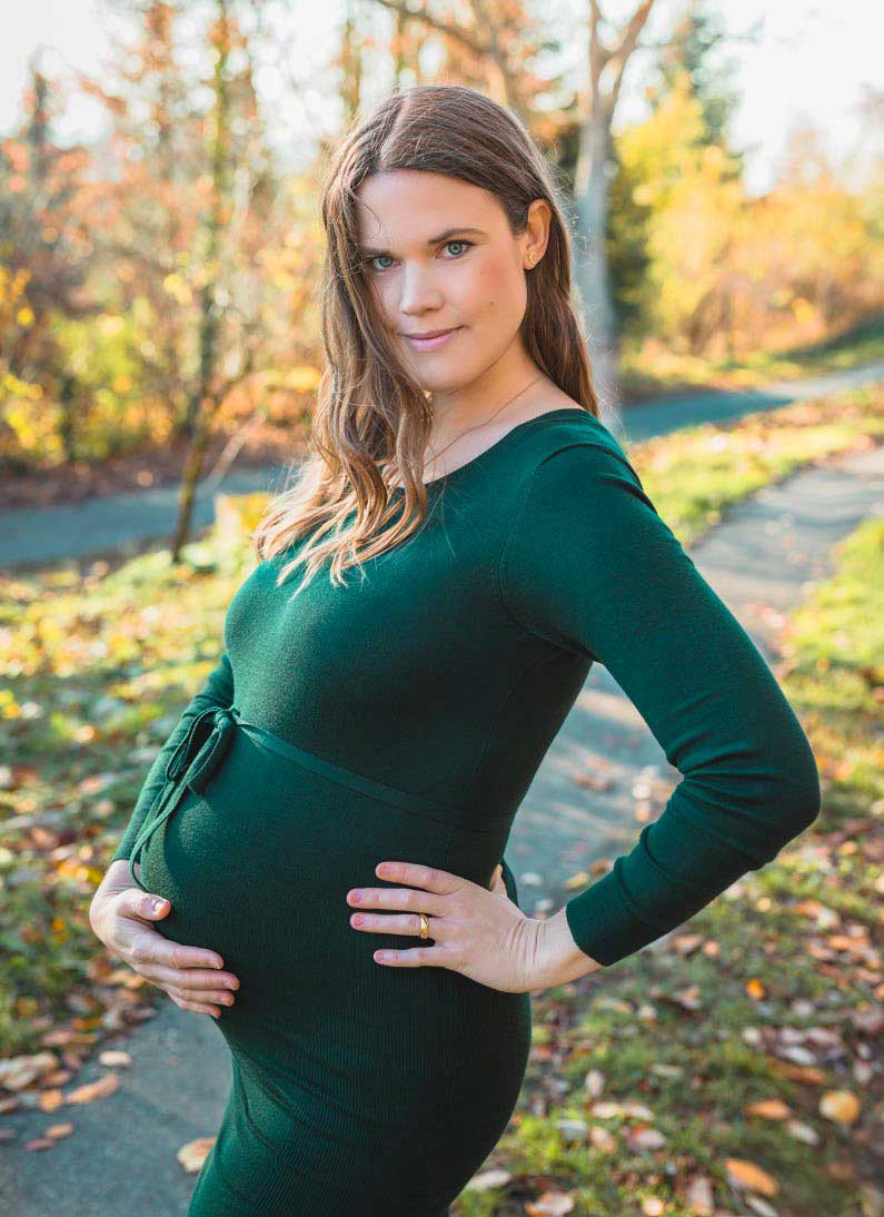 Aus der Froschperspektive kann der Babybauch insbesondere mit einem Weitwinkelobjektiv in seiner ganzen Rundheit dargestellt werden. Für ein Porträt, bei dem der Schwer­punkt auf dem Gesicht liegt, sind die geringen Brennweiten dagegen nicht immer vorteilhaft. Fokussieren Sie den Bauch bei offener Blende, so dass der Rest des Bildes unscharf wird. So setzen Sie gezielt einen Schwerpunkt.