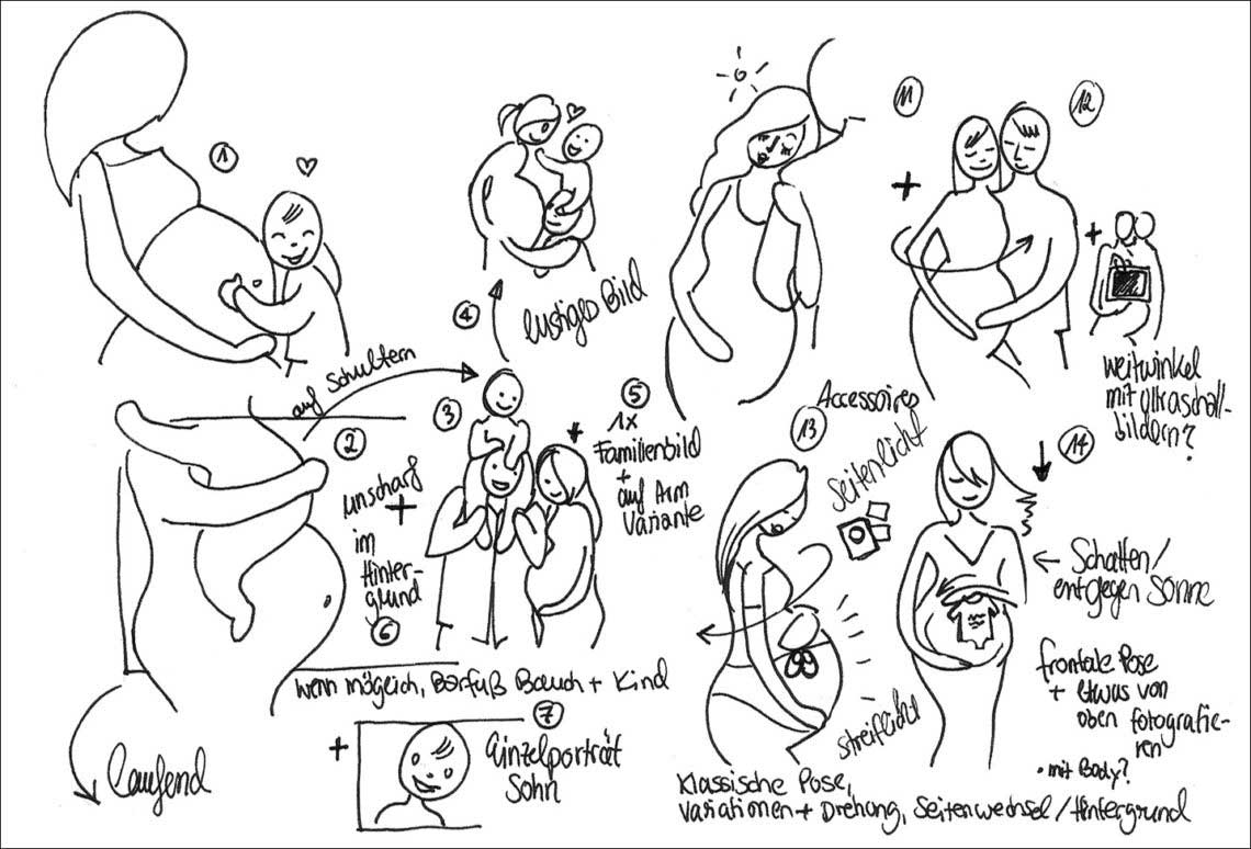 Vor einem Shooting skizziere ich zur Kundin passende Posen, notiere mir, welche Accessoires Verwendung finden sollen und was ich gegebenenfalls für die Session einpacken oder bereithalten möchte. Auch die Lichtrichtung für Aufnahmen im Freien oder im Heim der Familie, die Kundendaten und das vorausgesagte Wetter halte ich hier fest [1]. Meistens prägen sich mir diese Skizzen so gut ein, dass ich die Vorlagen beim Fotografieren ganz vergesse und nicht heraushole. Aber manchmal ist ein Shooting schwierig: Die Stimmung ist nicht gut, ich werde nervös, verliere den Faden, das Licht passt nicht oder es läuft einfach nicht rund. In diesen Fällen kann eine Planungsskizze ein kleiner Anker sein, an dem Sie sich festhalten können.