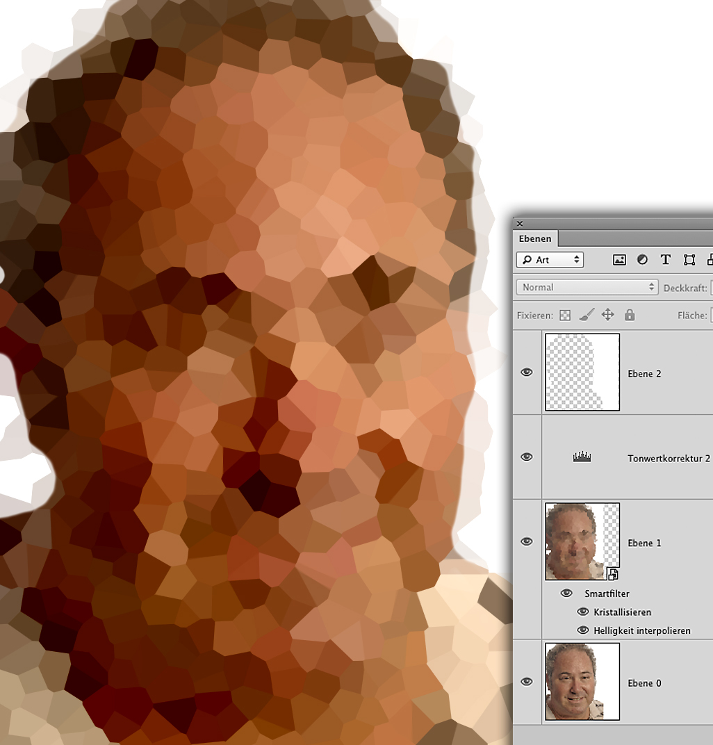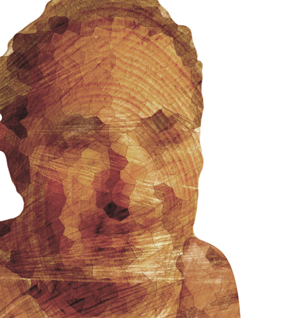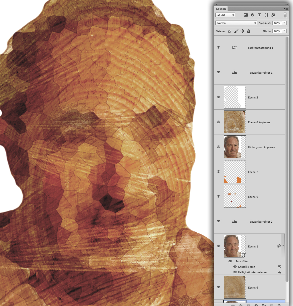 Also dann, ganz schnell: Eine superrealistische Umsetzung kannst Du dabei natürlich nicht erwarten. Wir beginnen mit einem beliebigen Porträtbild [1]. Dupliziere es auf eine neue Ebene (»Strg-/Befehl-J«) und mache es zum Smartobjekt. Nun weist Du der Ebene als erstes »Rauschfilter > Helligkeit interpolieren« zu, danach »Vergröberungsfilter > Kristallisieren«. Die Werte der beiden Filter können nun beliebig aufeinander abgestimmt werden. Wegen der entstehenden »Kristallisieren«-Zacken malst Du auf einer neuen Ebene einen einheitlichen Hintergrund, um eine abgerundete Kopfform zu erzielen. Das geht auch über Auswahl des alten Hintergrunds, neue Ebene anlegen, »Auswahl > Auswahl verändern > Abrunden«, dann »Auswahl verändern > Erweitern«, schließlich die Ebene mit einer Farbe – hier Weiß – füllen [2] . Besorge Dir ein Foto mit deutlicher Holzmaserung (notfalls Eye-Candy-Filter »Wood«). Lege es auf eine Ebene unterhalb des modifizierten Porträts und setze dieses auf den Mischmodus »Hartes Licht«; eine »Tonwertkorrektur«-Einstellungsebene hilft bei der Helligkeitsanpassung. Gegebenenfalls legst Du ein Duplikat im »Normal«-Modus mit schwacher Deckkraft darüber [3]. Soll die Maserung ausgeprägter sichtbar werden, duplizierst Du die Holz-Ebene und legst sie im Modus »Hartes Licht« nach oben. Darüber kommen zwei Einstellungsebenen: »Tonwertkorrektur« sowie »Farbton/Sättigung«. Falls es die Zeit zulässt, kannst Du auf einer Ebene oberhalb des gefilterten Porträts noch ein paar Retuschen vornehmen, um zu helle oder zu dunkle Stellen anzugleichen [4]. War das so schnell genug?