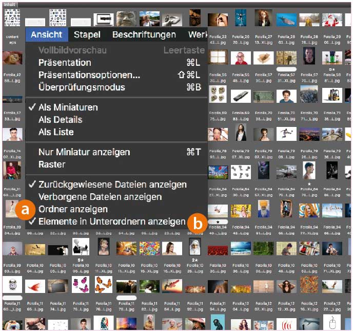 Über »Ansicht > Elemente in Unterordnern anzeigen« (b) blendet Bridge auch sämtliche Dateien ein, die in Unterordnern des aktiven Ordners liegen. Sie müssen sich also nicht von Ordner zu Ordner klicken, um diese Dateien zu sehen. Deaktivieren Sie »Ansicht > Ordner anzeigen« (a), um im Panel »Inhalt« nur die Dateien und nicht die Unterordner angezeigt zu bekommen.