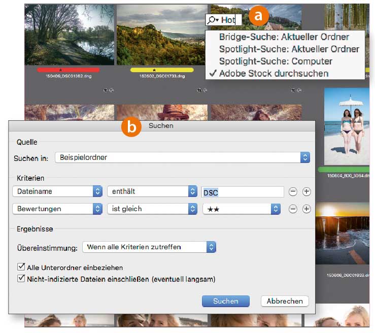 Im Suchfeld oben rechts (a) können Sie den aktuellen Ordner oder mit der Suchfunktion Ihres Betriebssystems (hier: Spotlight von macOS) auch Ihren gesamten Rechner durchsuchen und die Ergebnisse von Bridge anzeigen lassen. Eine Suche in Adobe Stock öffnet lediglich ein Webbrowser-Fenster. Genauere Suchkriterien stehen Ihnen unter »Bearbeiten > Suchen« zur Verfügung (b).