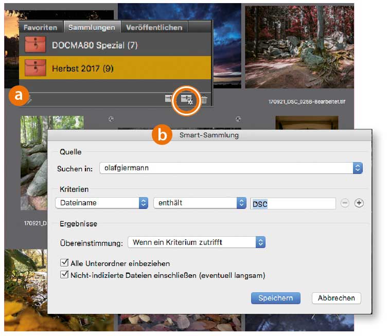 Smart-Sammlungen sind nichts anderes als gespeicherte Suchanfragen. Sie erzeugen eine Smart-Sammlung im »Sammlungen«-Bedienfeld (a); der sich öffnende Dialog (b) ist derselbe wie der von »Bearbeiten > Suchen«. Nach dem Anlegen brauchen Sie nur noch auf die Smart-Sammlung zu klicken, um deren Suchergebnisse in Bridge anzuzeigen.