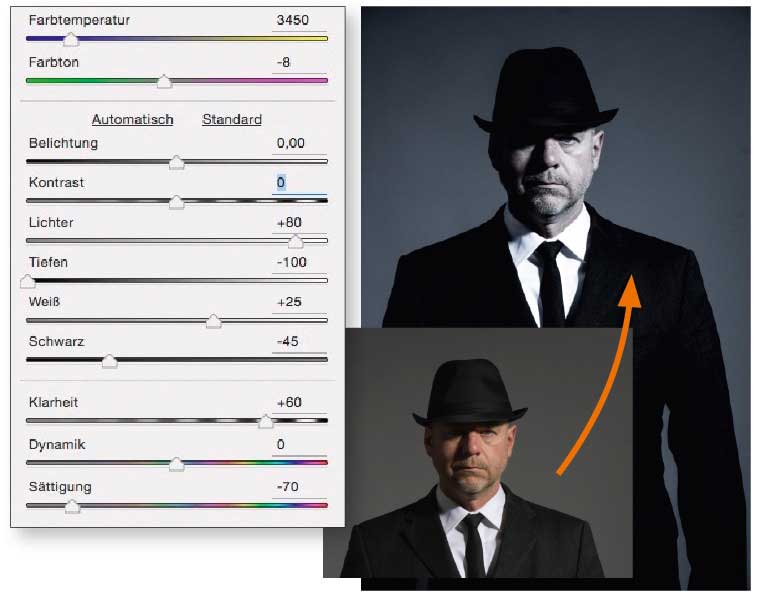 Als erstes optimieren Sie das Porträtfoto in Camera Raw. Ziehen Sie die »Farbtemperatur« je nach Geschmack und Ausgangsbild nach links. Durch diesen kühlen Weißabgleich passt das Porträt farblich besser zur geplanten Szene. Sorgen Sie nun für einen hohen Helligkeitskontrast, den Sie mit den folgenden vier Reglern deutlich feiner abstimmen können als einfach mit »Kontrast«. In diesem konkreten Beispiel stellen Sie dafür die »Lichter« auf +80 und »Tiefen« auf –100. Zusätzlich erhöhen Sie »Weiß« auf +25 und reduzieren »Schwarz« auf –45. Den Detailkontrast verstärken Sie kräftig durch das Anheben der »Klarheit«. Die gesättigten Hauttöne stören noch den Bildeindruck. Verringern Sie daher die »Sättigung«. In Photoshop angekommen, schieben Sie die Ebene am besten gleich in eine neue Gruppe, der Sie den Namen „Person“ geben.