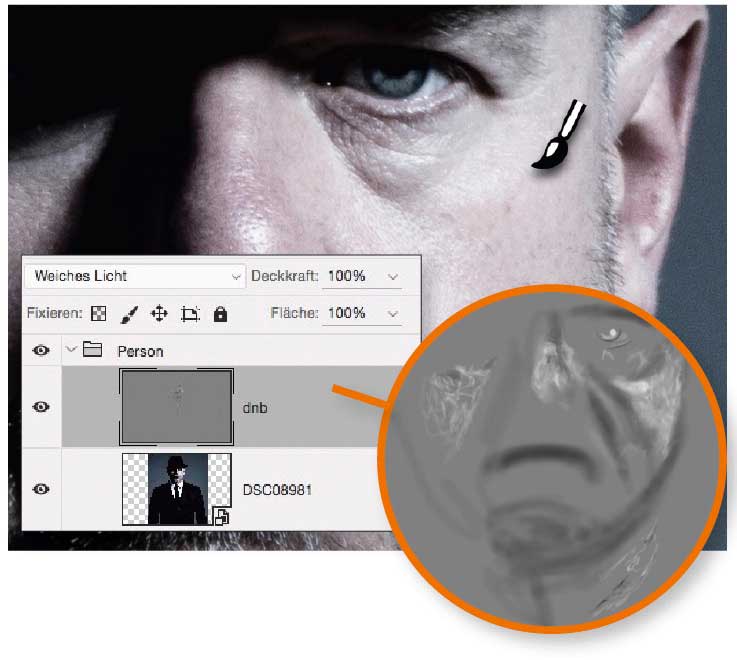 Durch Dodge & Burn können Sie die Kontraste im Bild selektiv verändern und auch kleinere Hautflecken im Gesicht entfernen. Beginnen Sie mit dem Letzteren. Arbeiten Sie auf einer mit 50 % Grau gefüllten Ebene. Diese legen Sie an, indem Sie mit gehaltener »Alt«-Taste auf das »Neue Ebene erstellen«-Symbol klicken und im sich öffnenden Dialog den »Modus« auf »Weiches Licht« setzen, darunter die Option »Mit neutraler Farbe … füllen« aktivieren und auf »OK« klicken. Setzen Sie die Vorder- und Hintergrundfarbe des Pinsels auf schwarz und weiß (Shortcut: »D«) und wechseln Sie zwischen diesen mit dem Tastenkürzel »X«. Arbeiten Sie mit einer geringen Deckkraft von nur 3 % und malen Sie mit Weiß über die Hautflecken, um diese abzumildern. Um die lokalen Kontraste zu optimieren, erhöhen Sie die »Deckkraft« des Pinsel auf 10 %. Malen Sie mit Schwarz über die Bereiche, die Sie abdunkeln möchten, und verstärken Sie Highlights mit Weiß.