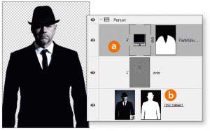 Da unser „Experte“ vor einem einheitlichen Hintergrund fotografiert wurde, ist das Freistellen einfach: Verwenden Sie das »Schnellauswahl-Werkzeug«. Aktivieren Sie die Option »Automatisch verbessern«, um direkt sauberere Konturen bei der Auswahl zu erhalten. Fügen Sie die Auswahl der Ebene als Maske hinzu, indem Sie in der »Ebenen«-Palette auf »Maske hinzufügen« klicken (b). Da das Sakko rein schwarz werden soll, legen Sie eine Füllebene »Farbfläche« mit schwarzer Farbe an. Erzeugen Sie eine Schnittmaske, so dass sich die Ebene nur auf die freigestellte Person auswirkt und sparen Sie durch Malen mit schwarzer Farbe Kopf, Hals, Hemd und Krawatte über die Ebenenmaske der Farbfläche aus (a).