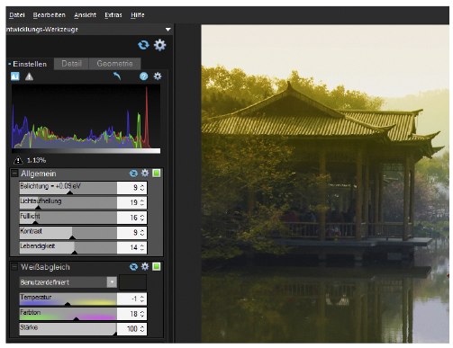 Etwas oberhalb von »Bildrauschen« sehen Sie den Vorgang »Scharfzeichnen«. Bestimmen Sie, wie von »Unscharf maskieren« gewohnt, zunächst den »Schwellenwert«, dann den »Radius« und zuletzt den »Stärkewert« der Schärfung. Eine Besonderheit ist der Maskierungs-Schieberegler zur Kantenerkennung. Damit konzentrieren Sie den Effekt der Scharfzeichnung stärker auf die Kanten und texturierten Bereiche. Flächige, detailarme Bereiche bleiben von der Anwendung verschont, um Bildrauschen nicht weiter zu verstärken. Möchten Sie zum Bereich »Entwickeln« zurück, speichern Sie das Bild zunächst ab, damit es mit den erstellten Bearbeitungen geladen wird.