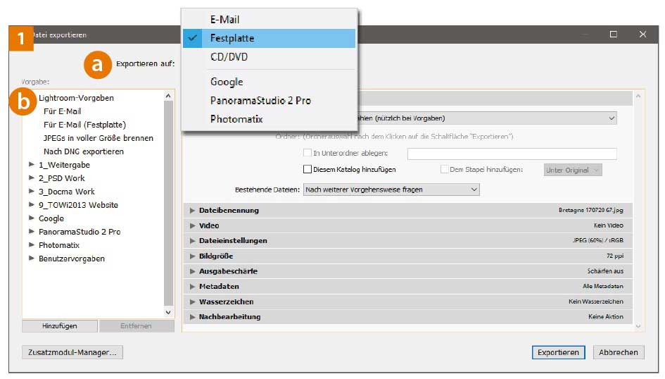 Im Dropdown-Menü »Exportieren auf« [1 a] wählen Sie das Exportmodul. Der Standard ist der Export auf die Festplatte. Neben dieser Möglichkeit liefert Lightroom die Module »E-Mail« und »CD/DVD« mit. Andere Exportmodule kommen dazu, wenn Sie beispielsweise Programme installieren, die mit Lightroom zusammenarbeiten.
