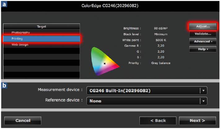 Nach dem Start der ColorNavigator-Software müssen Sie ein Target für die Monitorkalibrierung wählen (a). Da es hier um die Abstimmung auf den Drucker geht, klicken Sie auf das vordefinierte Target »Printing«. Mit einem Mausklick auf »Adjust« geht es weiter. ColorNavigator unterstützt die verbreiteten Farbmessgeräte von Datacolor und X-Rite, aber der EIZO ColorEdge CG246 braucht kein externes Messgerät. Am unteren Bildschirmrand verbirgt sich ein Sensor, der optimal auf den Bildschirm abgestimmt ist, und diesen wählen Sie nun im Menü »Measurement device« aus (b). Klicken Sie auf »Next«, um die Messung zu starten (c).