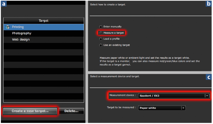 Nun ist der Monitor zwar kalibriert, aber bislang auf das allgemeines Target „printing“. Möchten Sie präziser werden, können Sie eigene Targets anlegen. Beispielsweise für Ihr Druckerpapier: Klicken Sie auf »Create a new target« (a), wählen Sie die Variante »Measure a target«, da Sie die Charakteristik des Papiers ausmessen wollen (b), und entscheiden Sie sich für ein Messgerät. Für eine Papiermessung ist ein externes nötig, sodass Sie ein kompatibles Farbmessgerät anschließen müssen (c) – in diesem Fall einen Datacolor Spyder4.